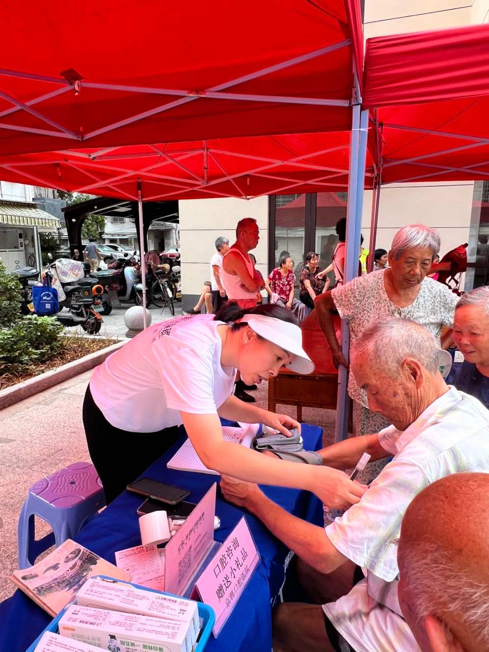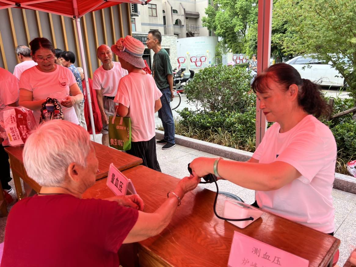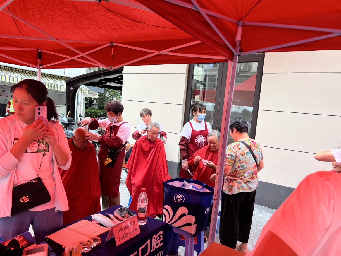 口腔健康、听力检测、视力保护服务构成了强大的健康关爱矩阵。京韩口腔医院、松丰口腔、杭州牙科医院越城分院的医护人员们耐心地为每一位居民进行专业口腔检查,讲解护牙知识,并赠送了精美小礼品。惠耳听力的摊位前,专业人员为有需要的居民进行听力筛查,提供爱耳护耳建议。杭港眼镜的志愿者们则为社区居民提供了细致的眼健康检查、眼镜清洗与调整服务,守护大家的“心灵之窗”。